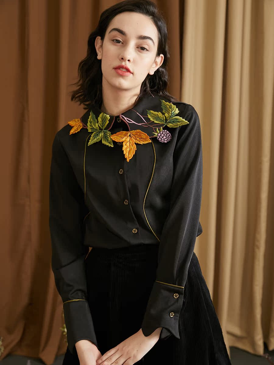 Original New Golden Leaf Embroidered Collar Bat Long Sleeve Retro French Shirt for Women Autumn and Winter