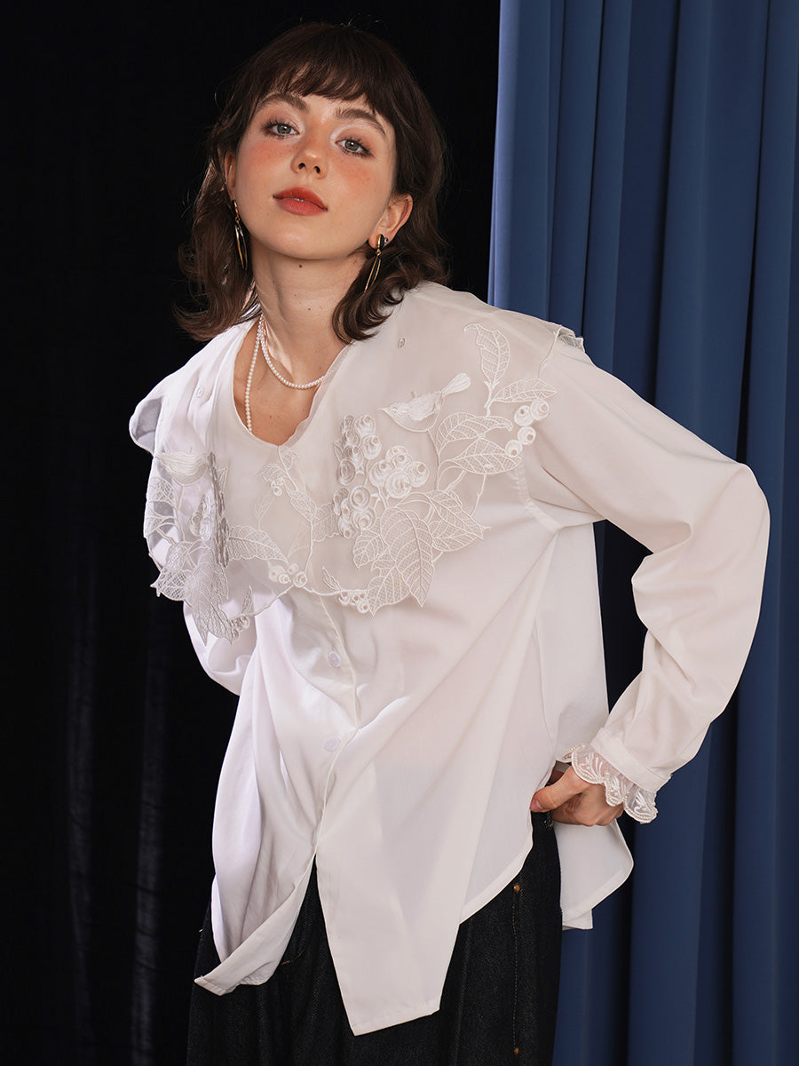 Original French antique white high-end shirt with palace style, heavy industry embroidery, big lapel top for winter inner wear
