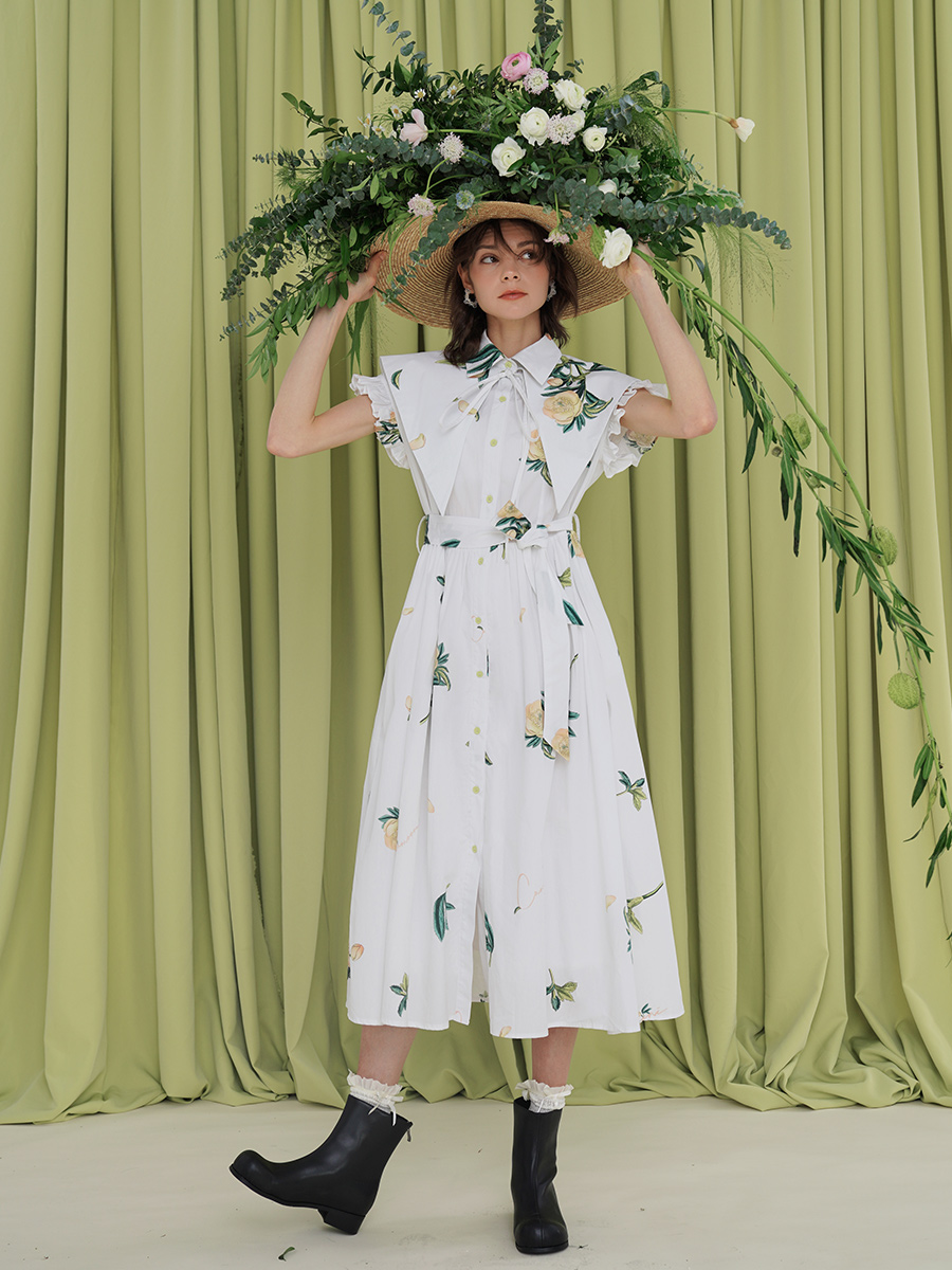 Original light French retro embroidered dress, summer sports bow long skirt, petal collar shirt