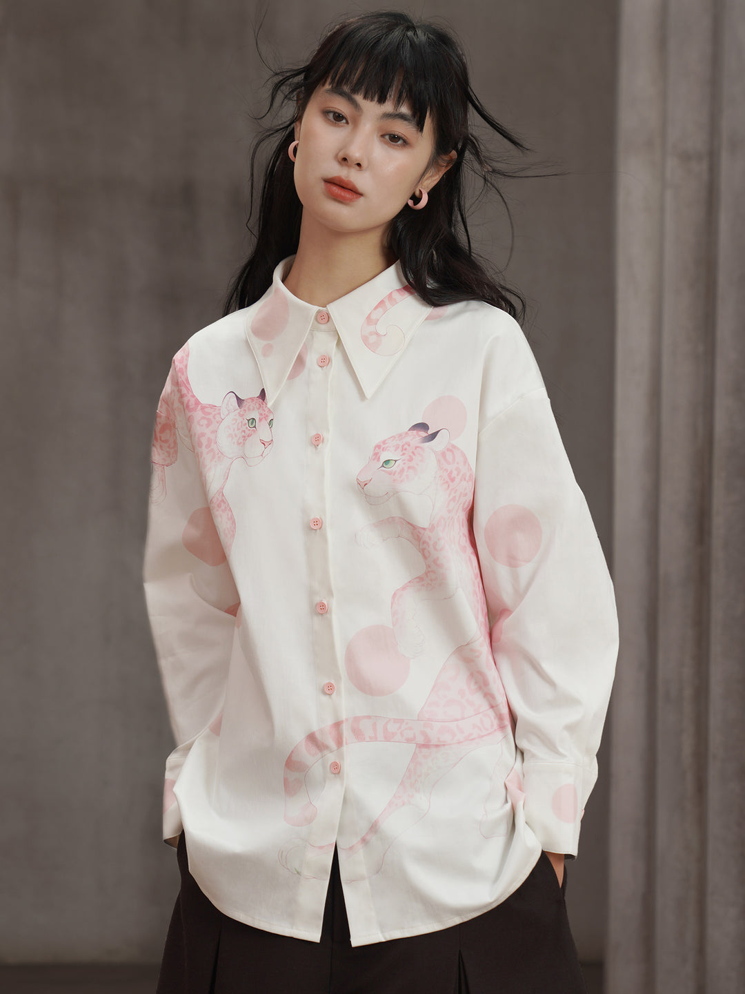 Original hand-painted pink leopard print shirt, niche retro designer style, lapel long sleeved loose top