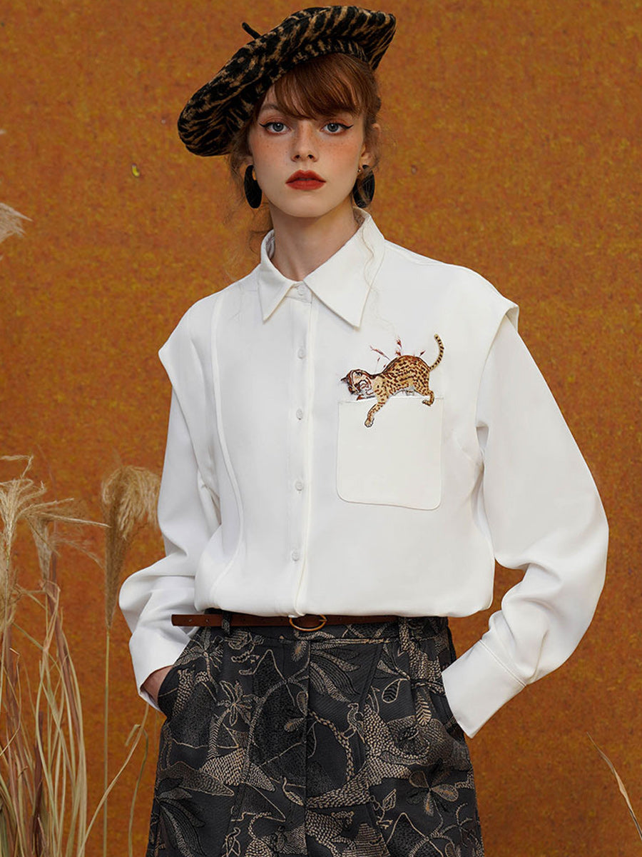 Retro plant embroidery collar shirt, squirrel and flower, niche designer top, off shoulder long sleeved jacket