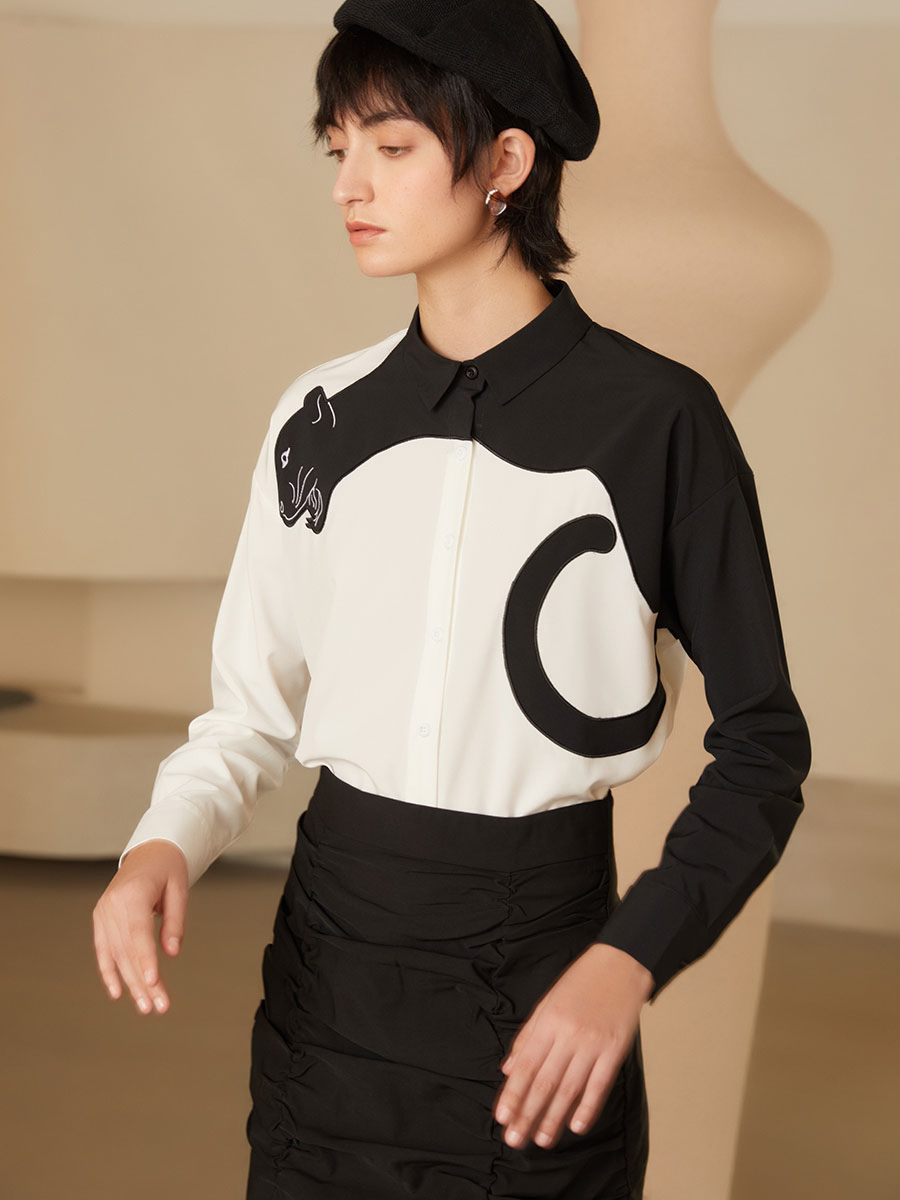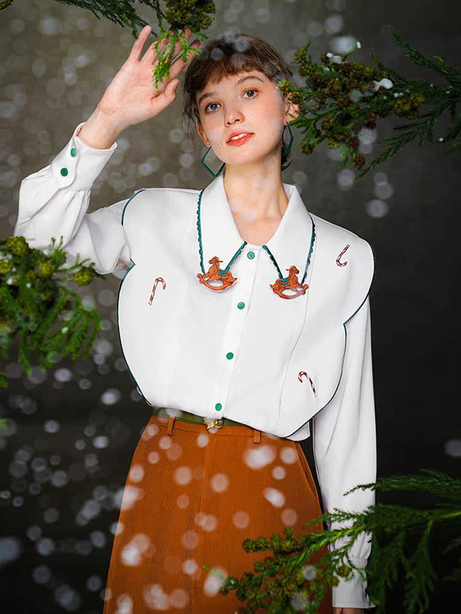 Original design, niche carousel embroidery collar splicing, retro contrasting white shirt, 2023 autumn/winter women's