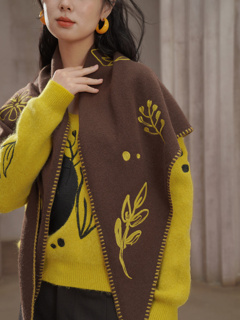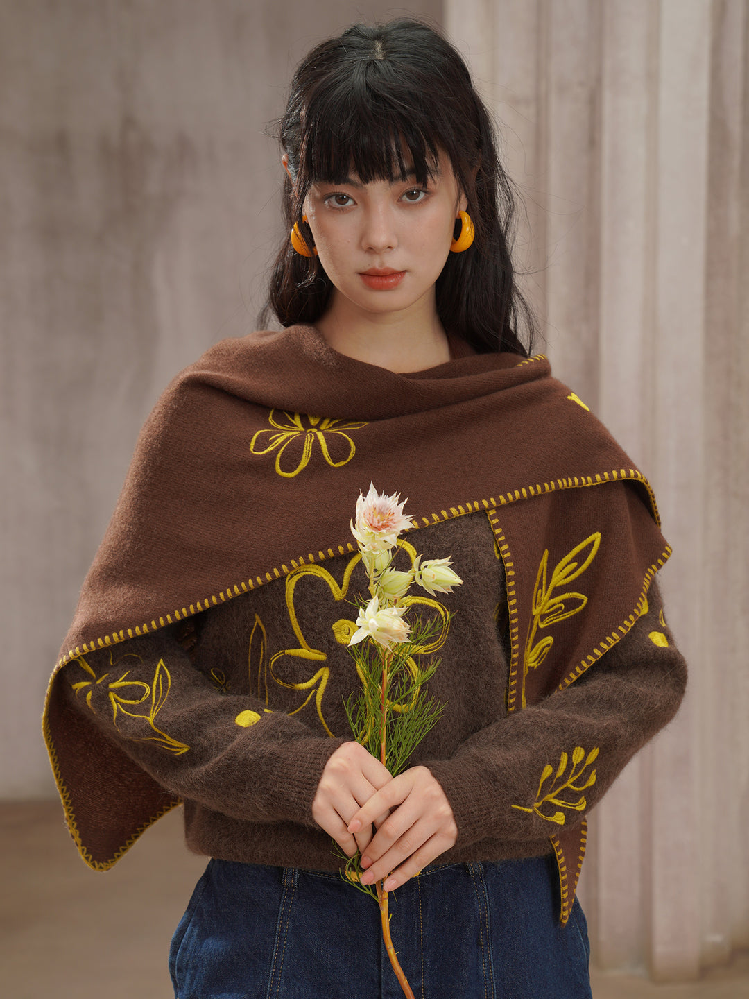 Original Warm Brown Embroidered Flower Knitted Shawl Vintage Manor Soft Glutinous Pure Wool Thick Scarf Accessories