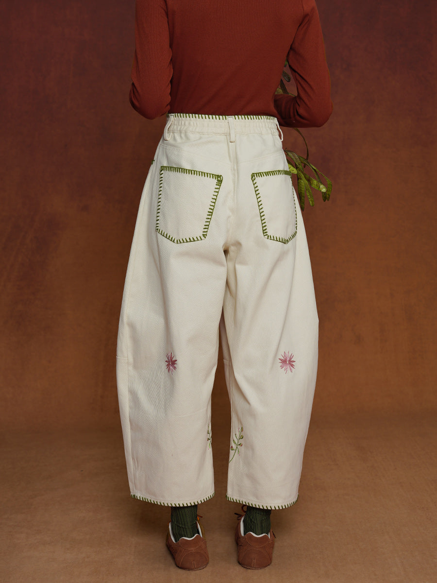 Original retro embroidered cactus casual pants for women, Cuban style high waisted straight leg wide leg pants, unisex style