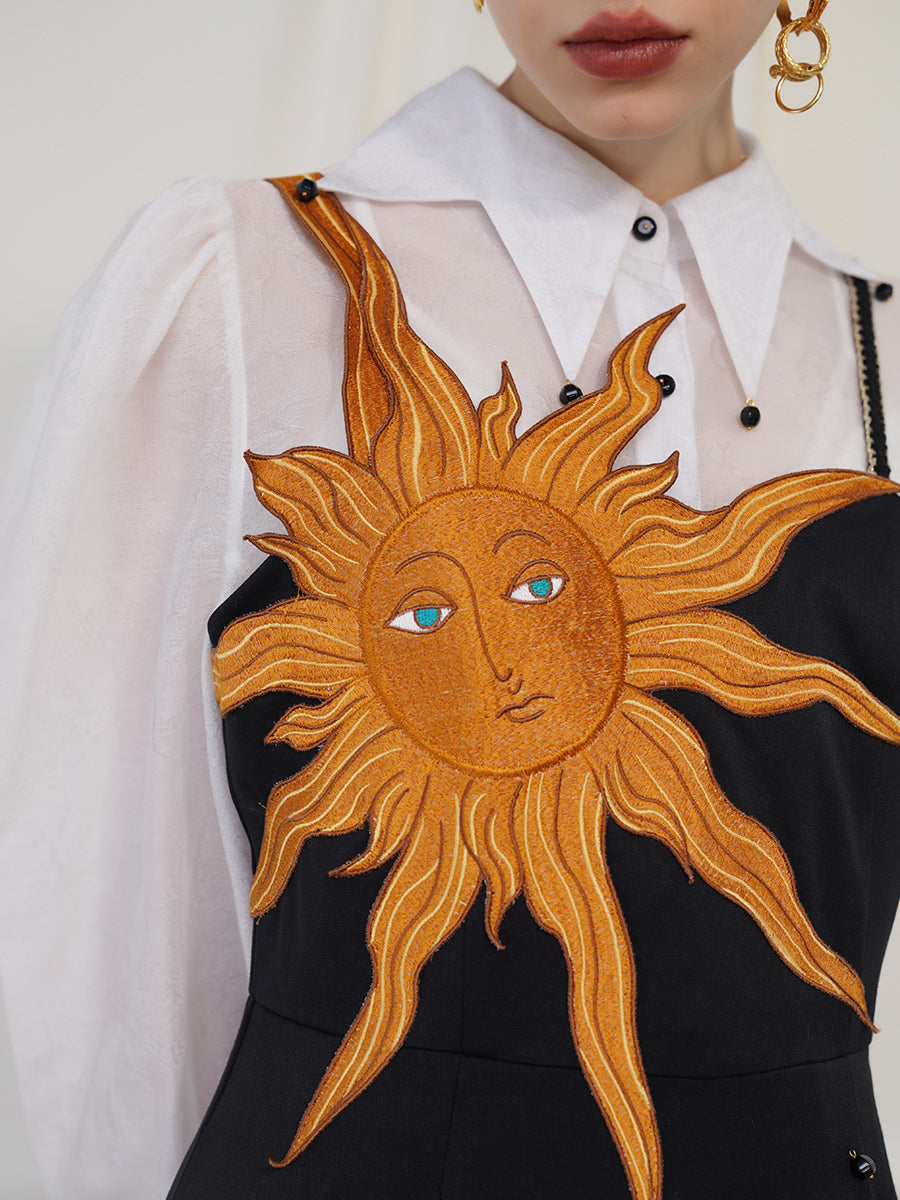 Velvet Noir French Retro Dress - Embroidered Large Lapel Slimming Black Midi