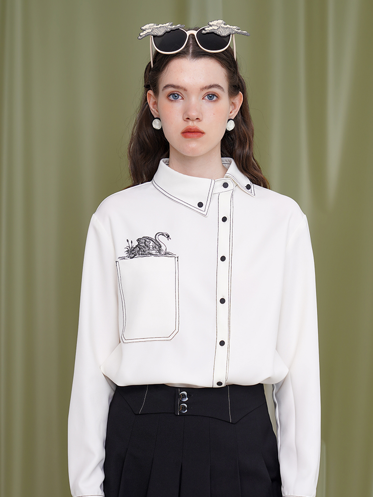 Original new niche fun little shirt for women, exquisite embroidery swan shirt, genderless retro top for couples