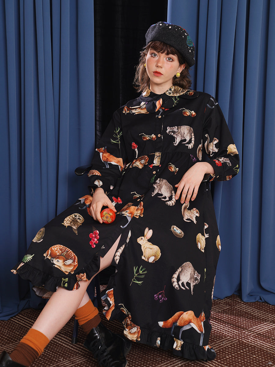 Original classical art style spring/summer dress with petal collar, retro illustration, animal print, long waist cinching skirt