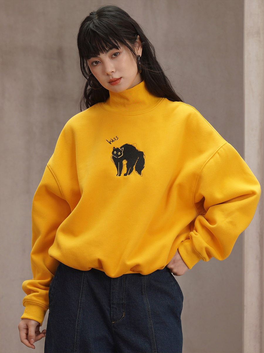 Sun Yellow Embroidered Black Cat Sweatshirt - Retro Streetwear Pullover with Half High Neck, Cute Embroidery Graphic Sweatshirt for Women
