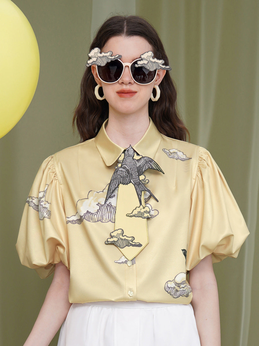 Original 2025 new design sense niche short sleeved printed bubble sleeve flower shirt women's retro top short